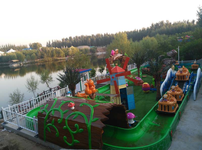 花果山漂流是一款兒童漂流類游樂場設備,玩法類似于軌道小火車,但是運行軌道為水道。 玩法: 水道中的水在兩個發動機的推動下緩緩流動,而漂流船則漂浮其上并隨著水流前進。在漂流船兩側裝有導輪裝置,可引導船只轉向并避免船只磕碰水道;坡道處則采用單獨的電機帶動導軌,利用掛鉤式裝置帶動船只爬坡,當船只至*高點處依靠重力和導軌的雙重驅動沖下坡道,好玩安全又刺激!