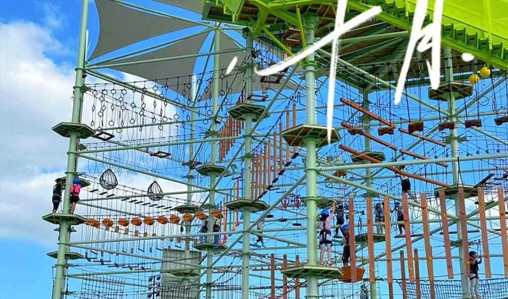 寧波“5號空間站-綜合探險水晶塔”,整塔高18m,共五層,設計有兒童步道、成人步道、攀巖、螺旋滑梯、低空蹦極和高空滑索等項目。